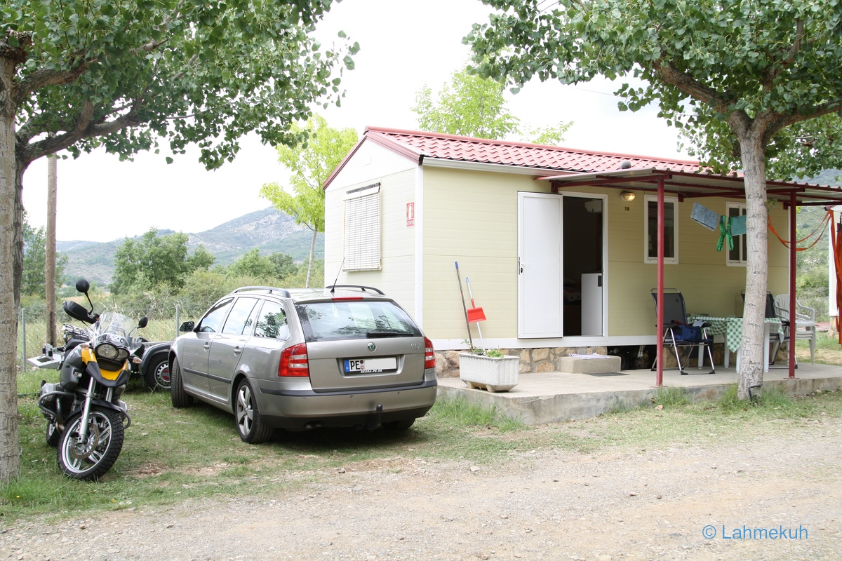 Als Quartier kam wegen der Ungezwungenheit nur ein Campingplatz in Betracht. Da wir beide aber keinerlei Ambitionen aufs Zelten hegen, kam widerum nur eine Blockhütte, ein Mobilhome oder vergleichbares in Betracht. Das ganze gepaart mit dem Wunsch nach örtlicher Zentralität im Zielgebiet (der Mopedtouren wegen) in Verbindung mit unserem sprachlichen Unvermögen (die Sprachbarriere eben) wurden wir nach kurzem Suchen fündig und buchten uns hier ein: Isabena