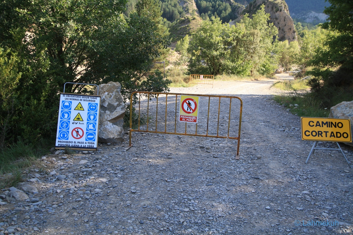 Der Rest des Erkundungstages ist schnell erzählt. Nach meiner Besichtigung der neuerlichen Kampfspuren an meinem Moped und ohne jede weitere Neigung, hier in Torla noch irgendetwas klären zu wollen, verließ ich den Ort und machte mich auf den Heimweg, der mich erneut über die wundervolle Straße nördlich der Sierra de Guara von Molino de Villobas nach Laguarta führte. An einer Stelle hielt ich dann auch tatsächlich an, nicht jedoch um die Straße bildlich festzuhalten, sondern die beeindruckende Felsenformationen im Flussbett.