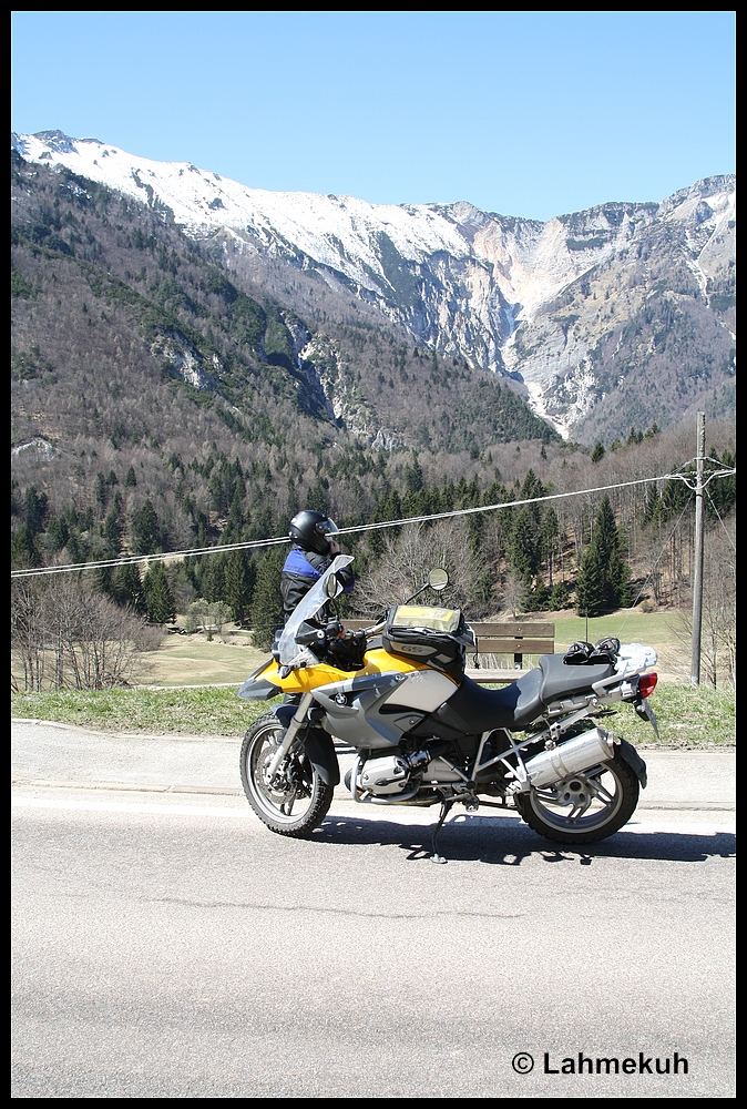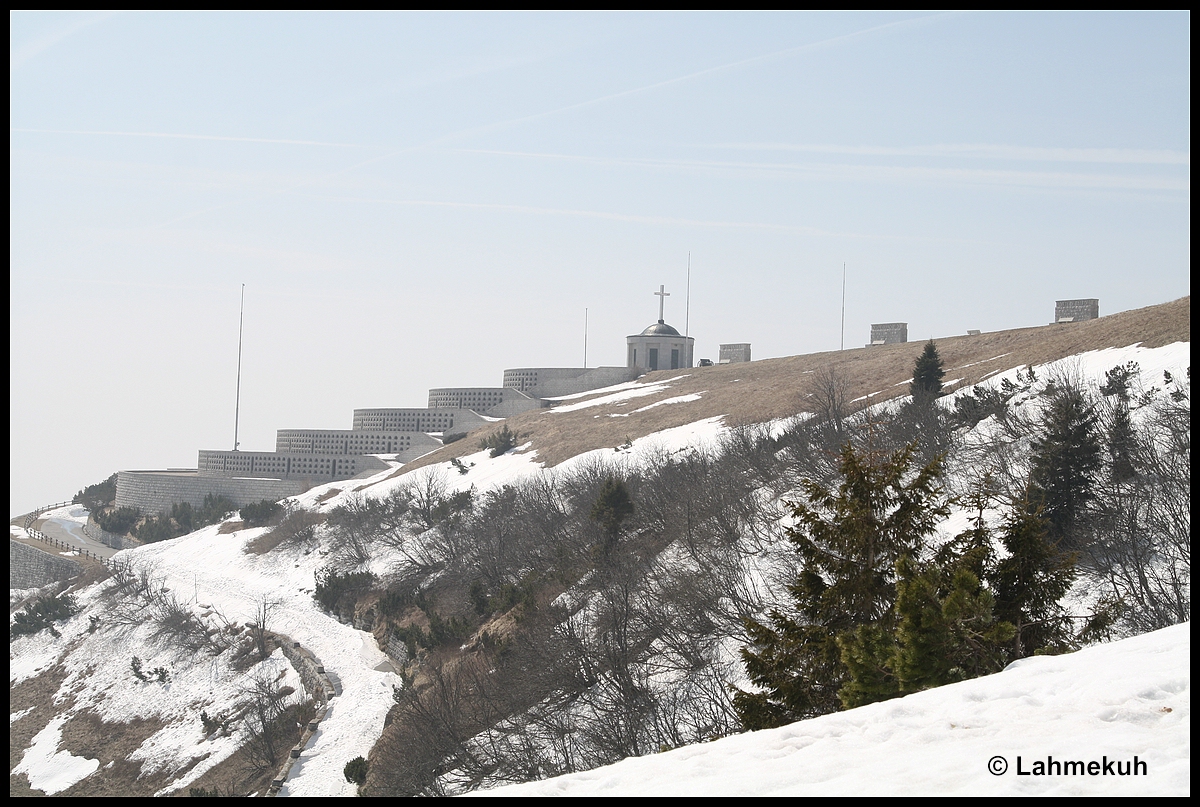 Der letzte Fahrtag ging zum Monte Grappa, vorbei an Valstagna. Auch der Monte Grappa war noch in weißes Zeug gekleidet Auf dem Weg zurück wurde ich auf den Ossario del Pasubio aufmerksam Den Fix habe ich nicht gesehen!?!? Und die Monte Baldo Höhenstraße war zwar in weiten Teilen schneefrei , aber eben nur in weiten Teilen. Sorry, kein Bild, ich war zu frustriert!