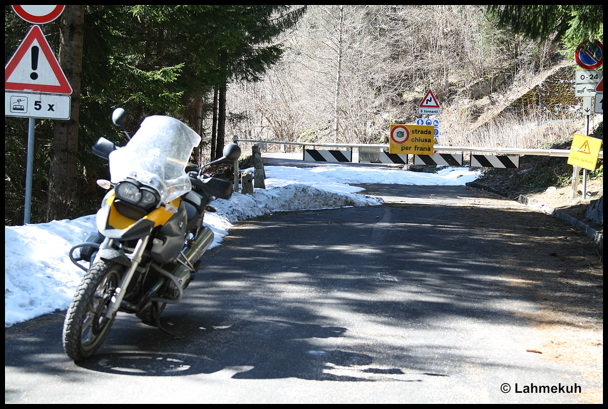 Auch der Weg zum Passo di Croce Domini führte schon kurz vor den Goletto Gaver zu einem Zwangsumkehrpunkt Dafür versöhnte dann der Blick auf den Idrosee Durch einen kleinen Schlenker entdeckte ich ein Kleinod, die Santuario Rio Secco Capovalle Von dort kam ich her Entlang der Straße über den Passo del Cavallino della Forbia und die Sella Cavacca in Richtung Treviso Bresciano Durch das Val di Valvestino – meine ganz persönliche Promillestrecke – kam ich auf der Suche nach einer Tankstelle durch Bogliaco bei Gargnano Anschließend musste ich unbedingt noch mal durch die Brasaschlucht, aber nicht hier entlang Brasa-Stau [/b]