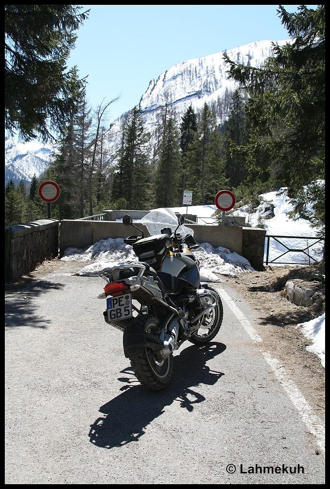 An einem der mopedfreien Tage ging es mit dem Auto hoch zum Einstieg in den Tremalzopass, aber nur ein Stückchen und zu Fuß. Eine tolle Landschaft zeigt sich dort oben! Am Fahrtag 3, diesmal wieder mit Tochter, ging es über die Kaiserjägerstraße mit Blick auf den Lago di Caldonazzo in Richtung Asiago. Eine Gedenkstätte für gefallene Kaiserschützen und Alpini an der SS 349 östlich des Passo di Vezzana. In Asiago Das nette Schottersträßchen führte uns leider nur bis hierher [/b]