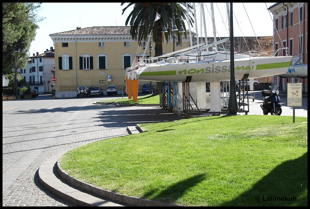 Zur guter Letzt noch einige Eindrücke aus Malcesine... ...mit einem wirklich niedlichen Parkplatzschildchen... ...und aus Cassone Ein kleines Resumee: Tochter zufrieden, Vater auch, Wetter ausnahmslos sonnig, Temperaturen für das Mopedfahren etwas Aprilkühl, die Straßen fast vollständig geräumt und befahrbar – außer natürlich die, die man um diese Jahreszeit ohnehin noch nicht befahren sollte – und vor allem, die Straße waren leer!