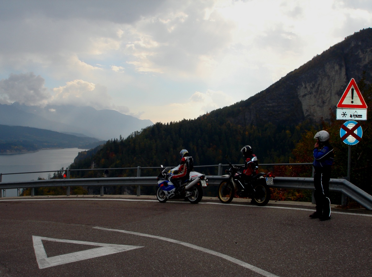 Ein Tal mit schönen langen Kurven macht es uns leicht ein wenig Zeit gut zu machen, um rechtzeitig zum Sonnenuntergang einen genialen kleinen Pass nach Trento runter in Angriff zu nehmen .. ich hab keine Ahnung wie er heißt, aber es ist ein wahres Kaninchen-Highlight.. Bild