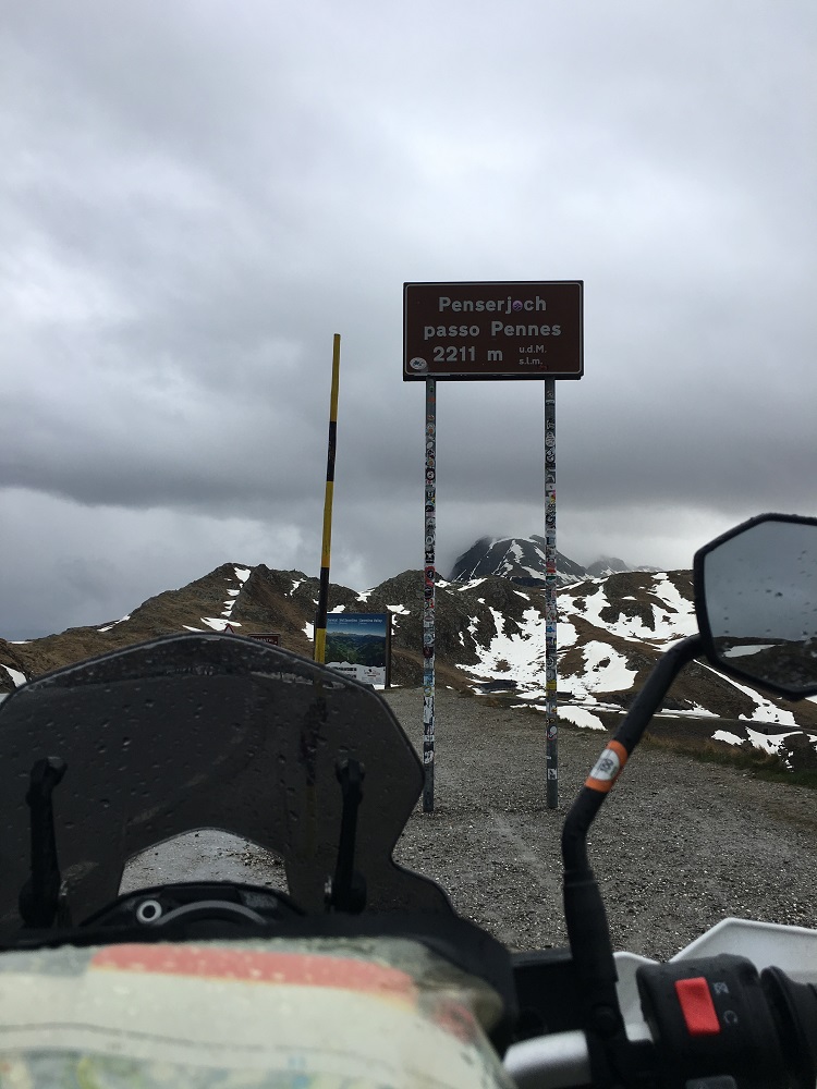 Immerhin sind wir irgendwann mal am Nachmittag in Sterzing und Töchterchen antwortet auf die Frage „Autobahn oder Penser Joch im Regen? – „Penser Joch!“ Und es war direkt witzig. Das Vertrauen in die Reifen kommt, die Temperatur fällt (3 Grad auf dem Pass) … und der Textmarker hinter mir (Marie im neongelben Regenkombi) hält sich wacker und bleibt dran.