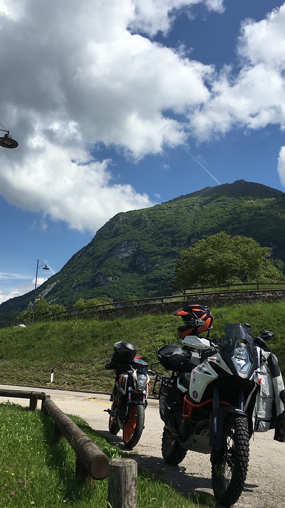 Am nächsten Morgen ziehen wir trocken über Madonna di Campiglio Richtung Gardasee. Je näher wir dem „See der Deutschen“ kommen, desto mehr Motorradfahrer sind unterwegs. Wir fahren die tunneldurchzogene Küstenstrasse am Westufer entlang und nehmen dann die Mini-Serpentinen hoch auf die Felsen bei Pieve. Sehr spaßig, wenn auch viel los war. Oben gibt es eine Pizza mit Blick über den See. Das entschädigt.