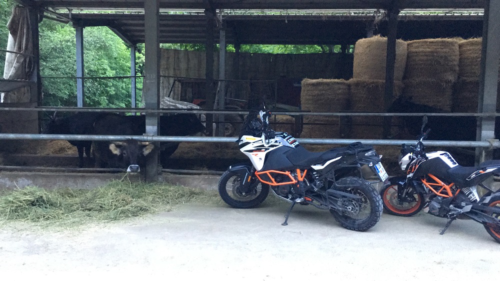 Aber so richtig Bauernhof! Die Motorräder werden vor den Kühen geparkt. Die Bäuerin kocht uns ein superleckeres Abendessen und alles ist gut. Riesenzimmer. Rustikal schick.