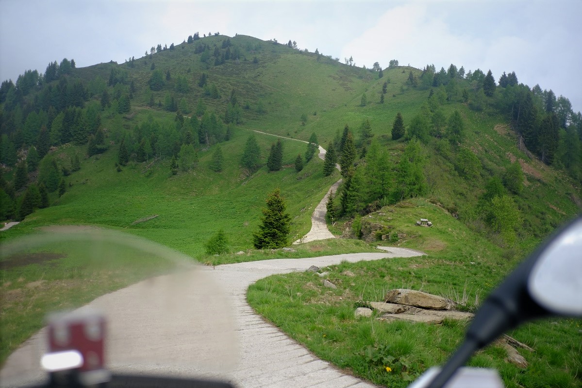 Aber fangen wir mal von vorne an. Kurz nach dem Hotel, also Richtung Malga Losa, ging es wieder lange und steil durch den Wald - auch wieder feucht und alles voller Tannennadeln.... Kein echter Spaß, aber wenigstens war ich völlig alleine auf der Straße, hatte frische Luft und die Husky schnurrte brav hoch. Heute konnte ich übrigens meine Offroadfähigkeiten mehr als geplant auffrischen.