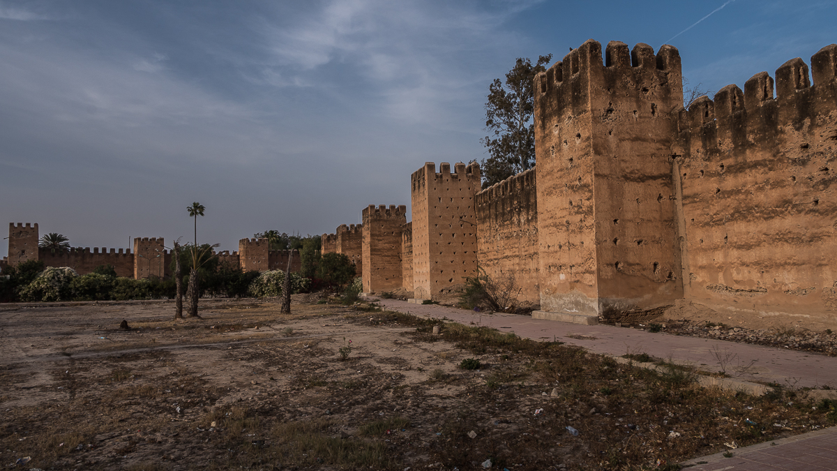 Unsere Unterkunft, das „Dar Tourkia„, entpuppt sich als weiteres Paradies. Versteckt hinter alten Mauern und einem grossem Holztor liegt ein traumhafter orientalischer Garten mit Palmen, Orangenbäumen, Bougavillea, Zitronenbäumen, Euphorbien aller Art, Kakteen usw. In der Mitte der türkisblaue Pool um den sich die Zimmer gruppieren. Riesige Zimmer mit alten Holzmöbeln und im maurischen Stil gekachelte Bäder mit goldenen Messingwaschbecken. Es ist wie in 1001 Nacht und wir können unser Glück kaum fassen. Ein Teil der das Grundstück umgebenden Mauer gehört zur alten, aus Lehm gebauten Festigungsmauer welche sich rund um die ganze Stadt herum zieht und welcher wir später am Abend fast um die ganze Stadt herum entlang spazieren.