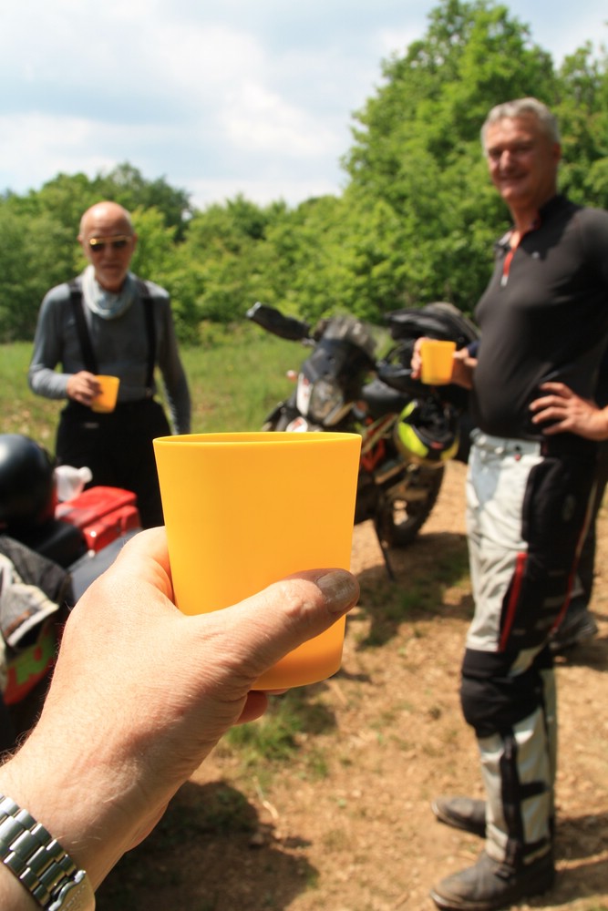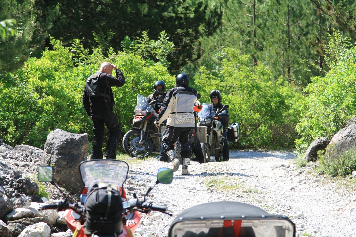Herrliche Landschaft. Wenn Winnetou mit seinen Apachen aus dem Gebüsch gesprungen wären hätte es mich nicht gewundert. Aber es kam nicht Winnteou sondern eine Gruppe Tschechen. Auch nicht auf Pferden sondern mit KTM 990, BMW und Honda Varadero. Haben ausgesehen als wären sie nicht das erste Mal auf einem Motorrad gesessen. Natürlich haben wir uns beratschlagt. Die Kollegen haben mein Gespann angeschaut und fachmännisch gefragt, ob es denn wenigstens einen angetrieben Seitenwagen hätte… No ? No chance war die Erwiderung. Sie hätten sich so jeder zwischen drei und fünfmal abgelegt – und wer schon mal einen Tschechen im Gelände erlebt hat, weiß was das bedeutet.