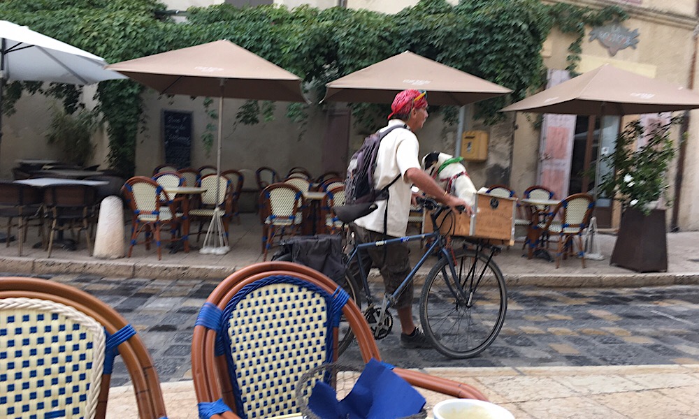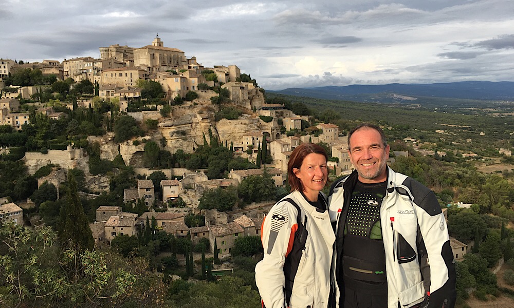 Heute Tour #5: Abfahrt um 6:30, der Ventoux schon im Morgenlicht aus zu sehen von unserem Haus Fahrtrichtung Gordes ... dort sind wir erstmal verhockt, so toll war die Aussicht: Blick Richtung Luberon (auf dem Kamm waren wir schottenderweise letzte Woche): Dann weiter nach Lourmarin mit Frühstück mitten drin: