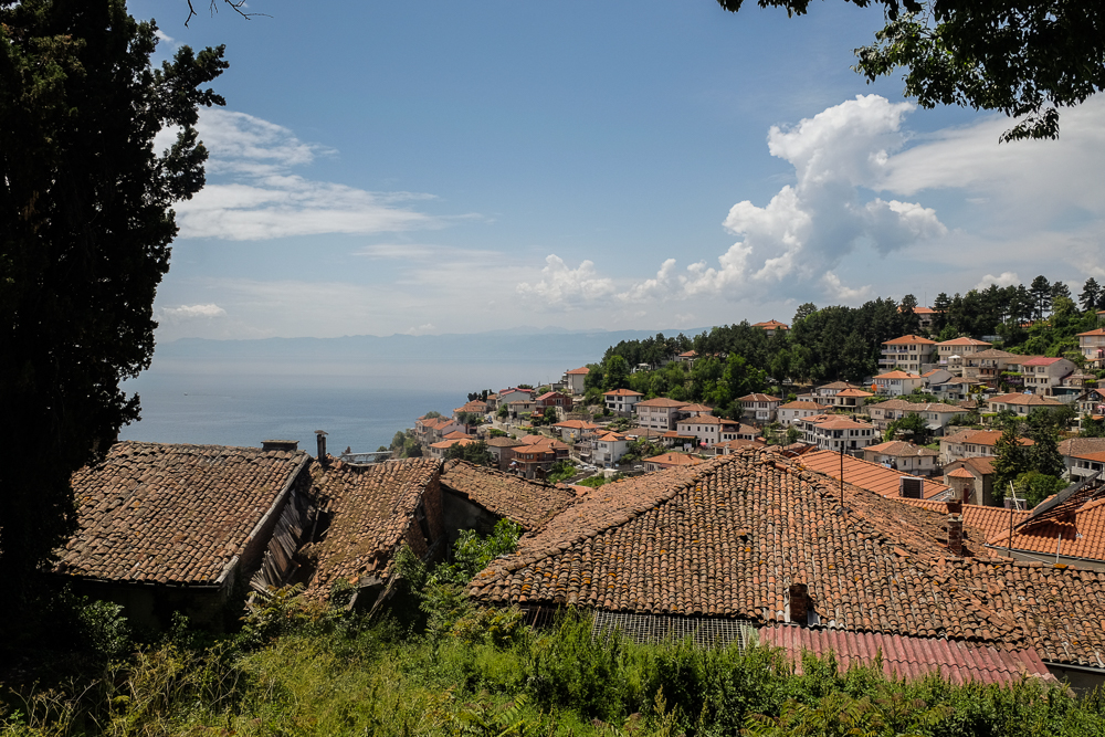 Das Dörfchen neben Orid (oder ist es noch ein Teil von Orid?) ist echt sehr nett. Es schmiegt an einen Felsen und hat zwei Lokale die nicht gerade billig sind, aber der Fisch war ausgezeichnet. Das Bier ist kalt. Und die Aussicht wunderbar.