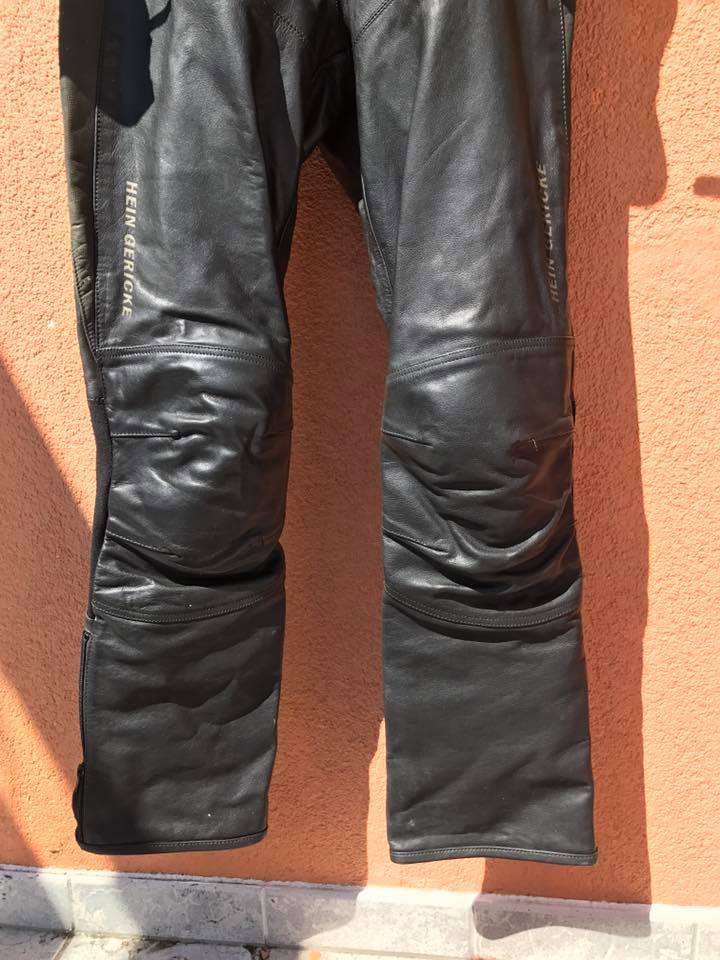 Leider wurde das Ledergwandl über den Winter von den fiesen Ledermotten enger genäht, mein Weibchen passt also nicht mehr so recht rein. Hängt nun seit einem Jahr im Kleiderschrank und nimmt mir den Platz für meine Terror-Racing-Asphaltschleifer-Kombi weg.
