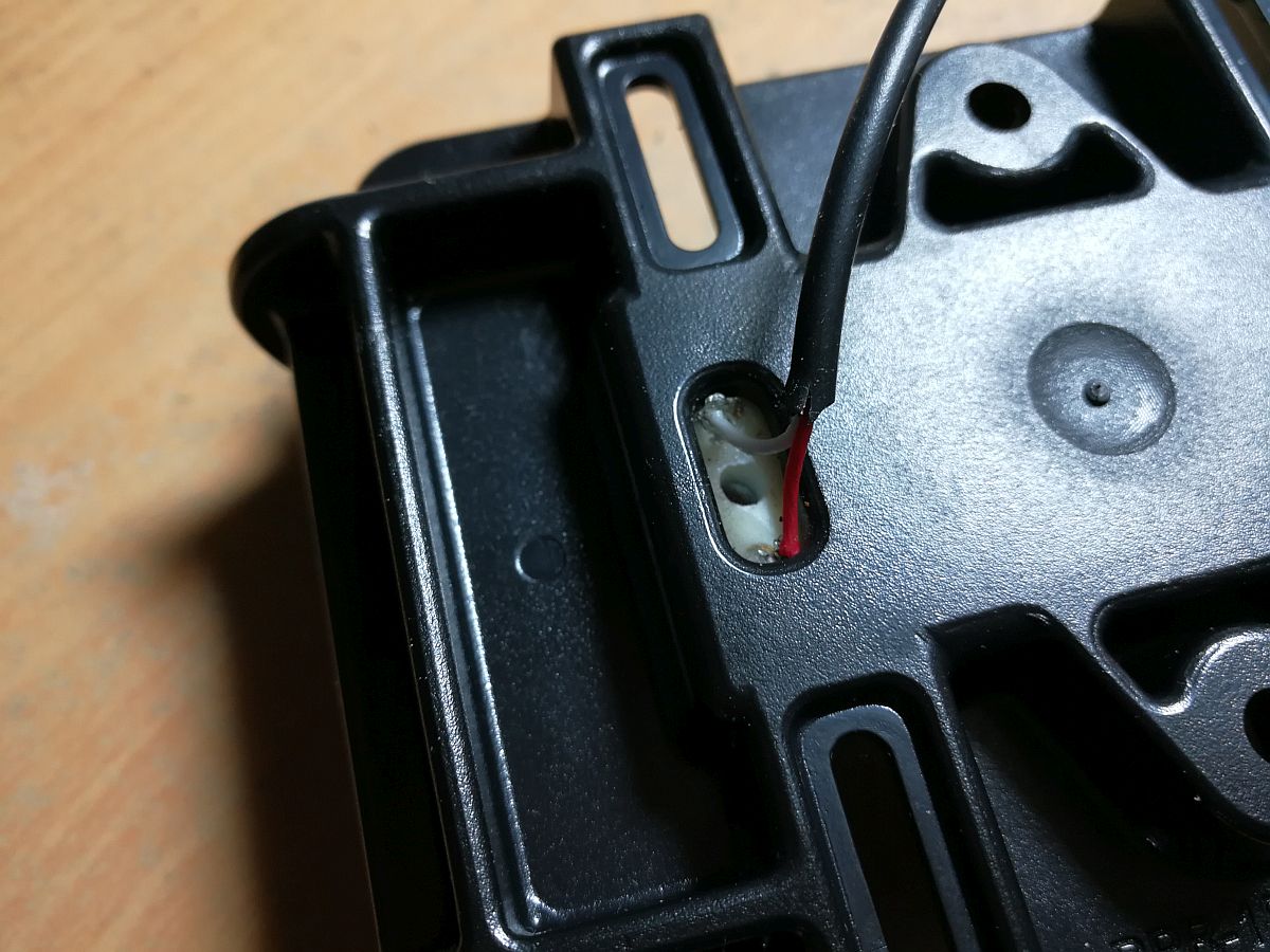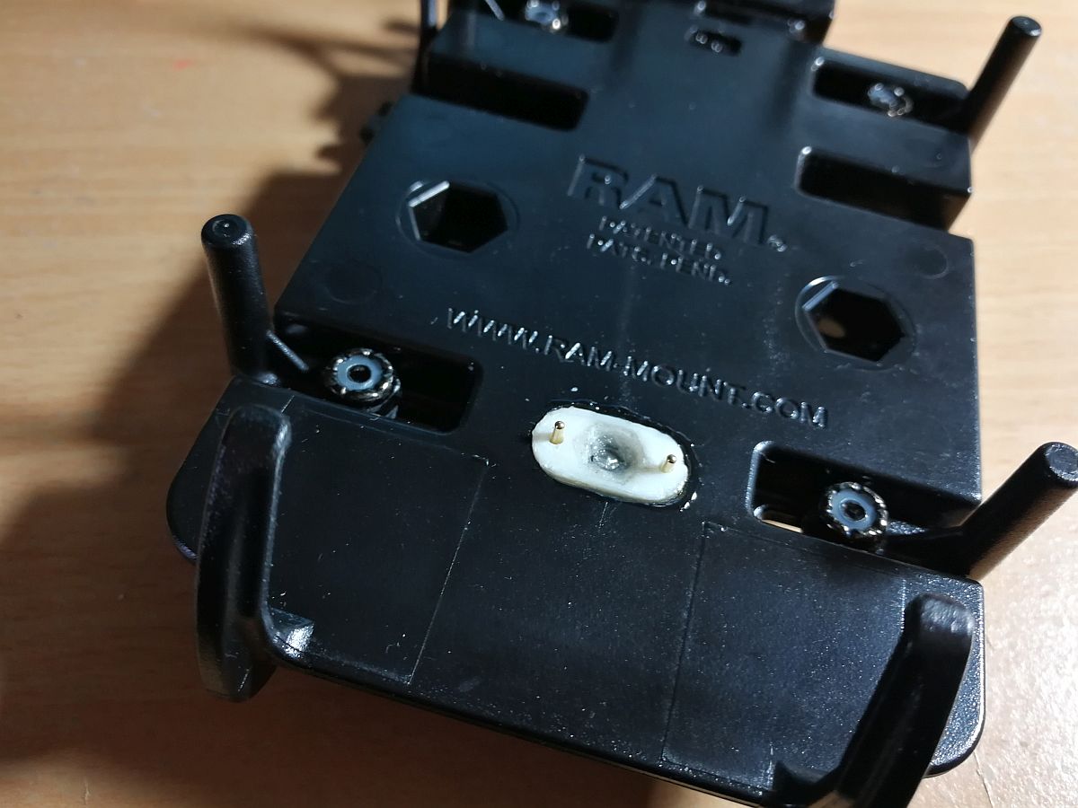 Basis der Halterung ist ein RAM-HOL-PD3U, durch dessen untere Öffnung man die Ladekontakte des eingelegten DF Pro erkennt. Was liegt näher, als dort hinein einen Korpus mit Pogo-Pins zu verpflanzen. Da ich nicht maschinell fräsen kann, kam mir ein Transalp-Forenkollege mit seinem 3D-Drucker zu Hilfe. Verwendetes Material war ASA. Die Pogo-Pins gibt es in Deutschland bei Develektro. Etwas besagte Öffnung aufdremeln, Kontakte anlöten – fertig! Achja, die Stiftführungen des Korpus mußte ich noch etwas aufbohren und die Stifte hinterher mit ein wenig Epoxy fixieren.