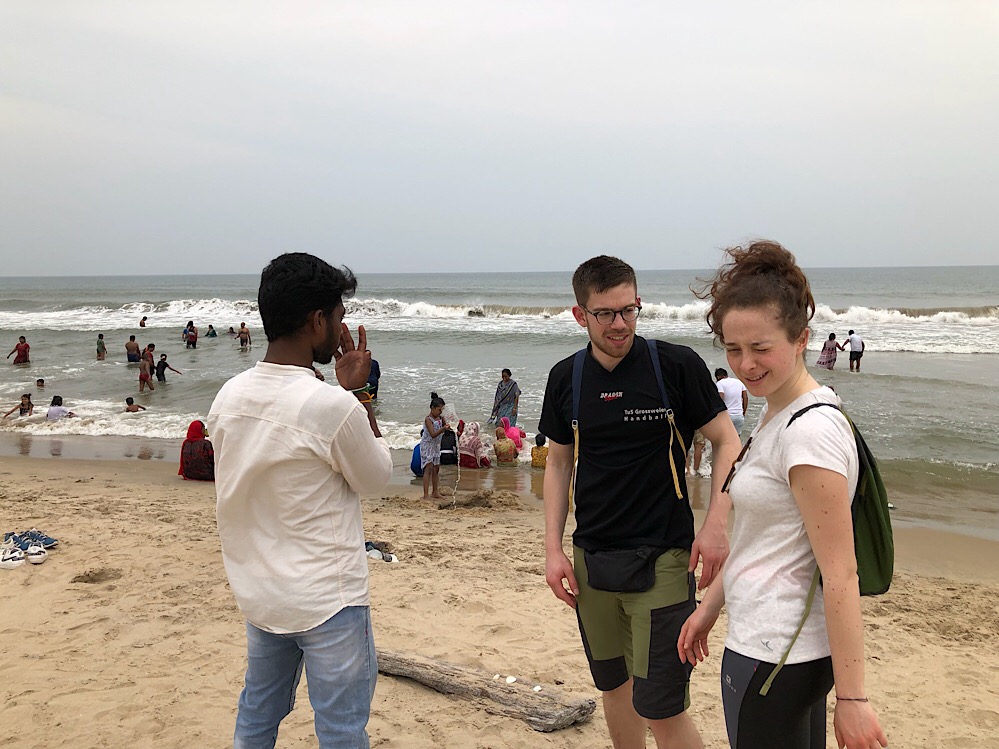 Nach rund 10 Minuten legten wir dort an und verbrachten eine halbe Stunde ohne Planschen am Strand. Es war so ein bisschen typisch indisch: Riesenschilder „Schwimmen verboten“ und eine Menge Leute im Wasser. Und pfeifende Schiedsrichter (das waren Schwimmaufseher), die niemand ernst nahm.