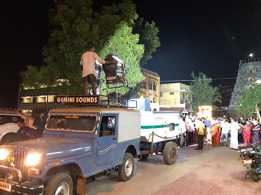 ... dann das Musikfahrzeug gefolgt von Band und maskierten Tänzern, die Jungfrauen, ein Jeep mit daraufmontierten Flakscheinwerfern und Riesendieselgenerator dahinter, dann viele Männer im gleichen Hemd und schliesslich, in gleißendem Licht, Hari in einer hellerleuchtenden Kutsche, gezogen von zwei abgemagerten, geschmückten Schimmeln - wie ein Maharadja! Keine Spur von der Braut. Feuerwerk wurde gezündet und die Band spielte, dass einem die Ohren wegflogen. Es hatte etwas von rhythmischer, badischer Guggenmusik zur Fasnacht und es wurde auch dazu getanzt. Sensationell! Ich hätte fast ein paar Tränen der Rührung verdrückt für den lieben Hari - was für ein Akt ihm zu Ehren! Ich war wirklich ergriffen!