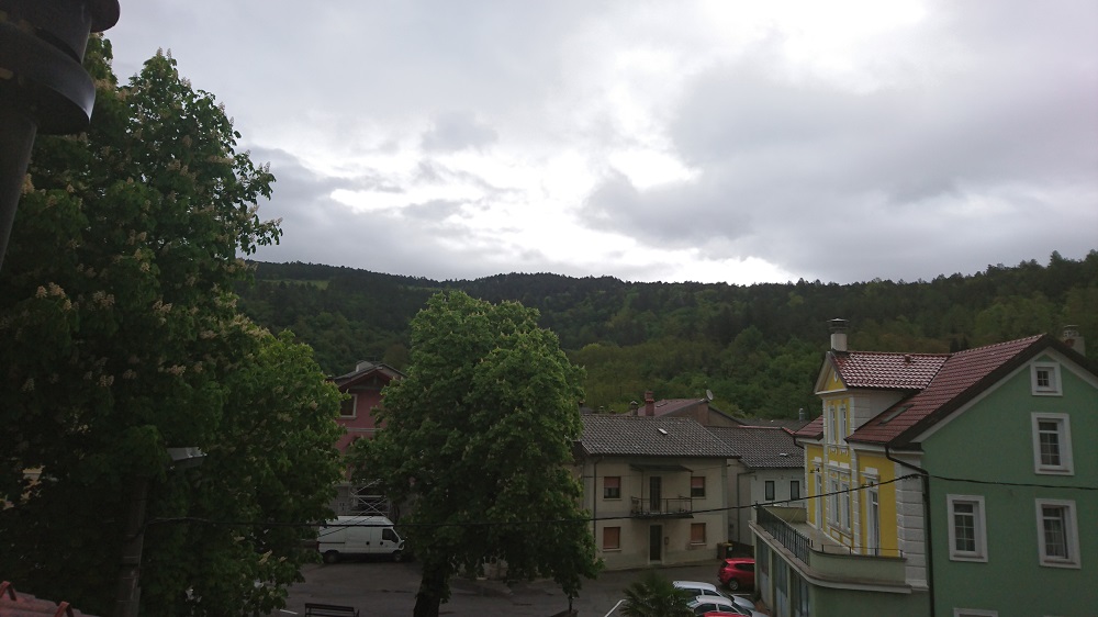 Zeitig am Morgen ging es unter dem wolkenverhangenen - aber mittlerweile regenfreien - Himmel in das gegenüberliegende Lokal zum Frühstück, weil unsere Herberge Sonntag geschlossen ist. Das Frühstück glich einer deftigen Jause zu Nachmittag (mit Speck, Hartwurst, Pfefferoni, Zwiebel, usw...), war aber sehr gut und feudal. Eine Vielzahl an Einheimischen war schon anzutreffen und so genoss` ich den Trubel.