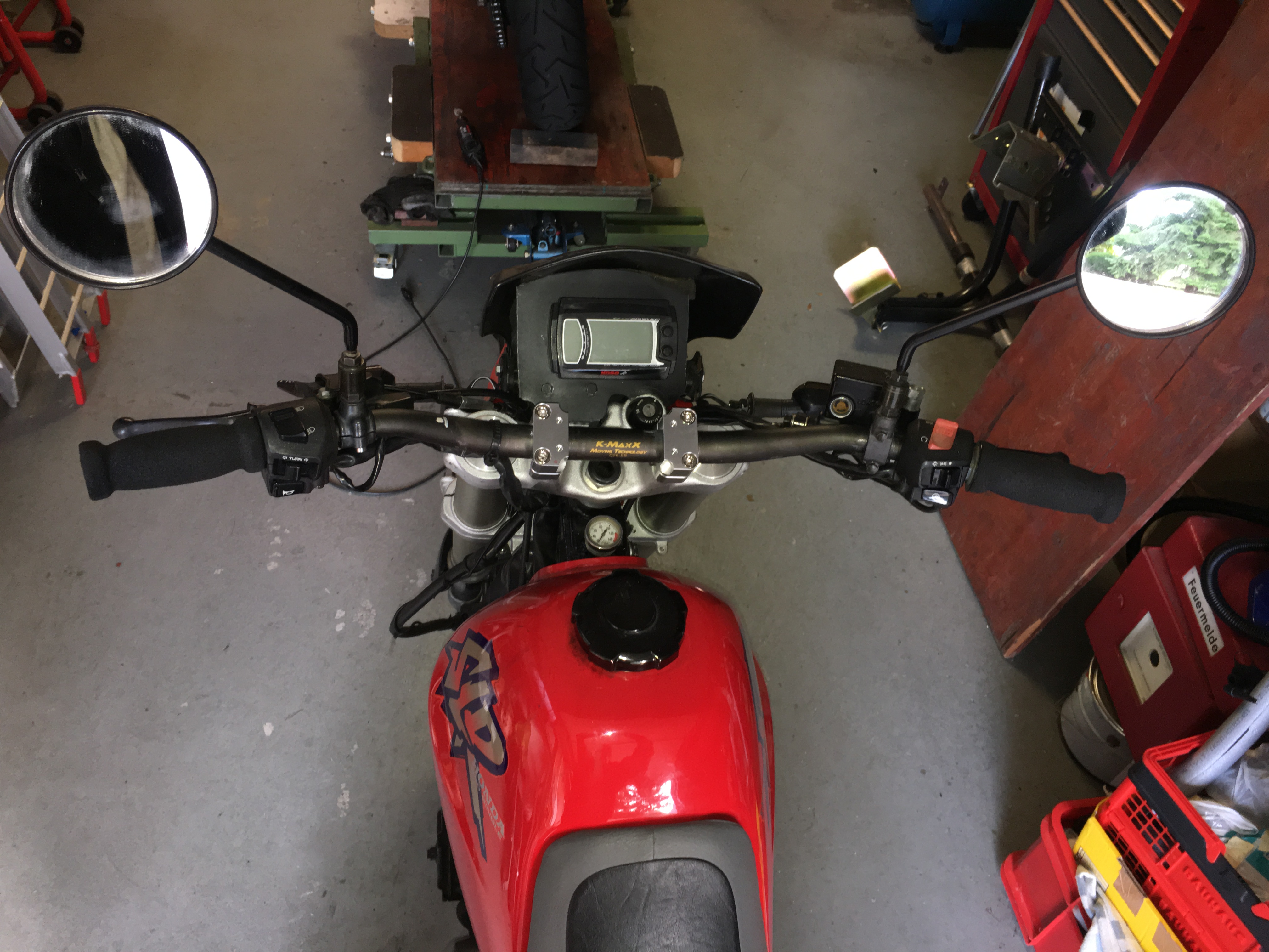 Die Geometrie des Originallenkers war mir zu unkommod. Ersatz fand sich im Regal, den K-Maxx hatte ich schon auf meiner Duc. Leichte Anpassungsarbeiten erforderlich ...