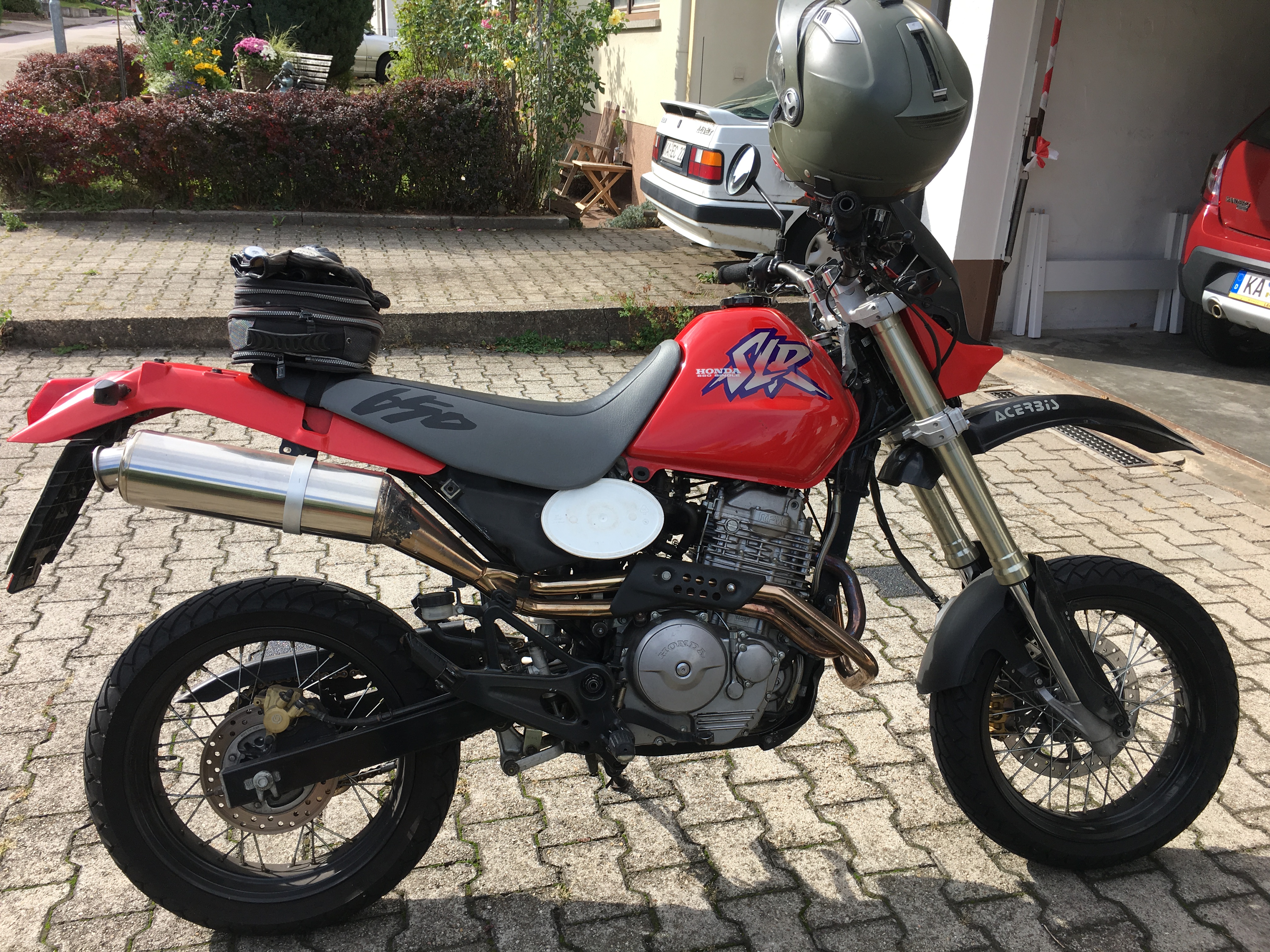 Der Kenner sieht, mit SLR650 hat das Mopped nicht mehr viel gemeinsam. Kurz nach Einzug in die heimische Garage wurden u.a. die Fahrwerkskomponenten einer FMX650 verbaut, der Motor mit Ölkühler thermisch standfester gemacht, usw... Auch der Umstand, dass das Krad die letzten 12 Jahre gerademal 7tkm die Straßen gesehen hat, waren Gründe es in Familienbesitz zu belassen.