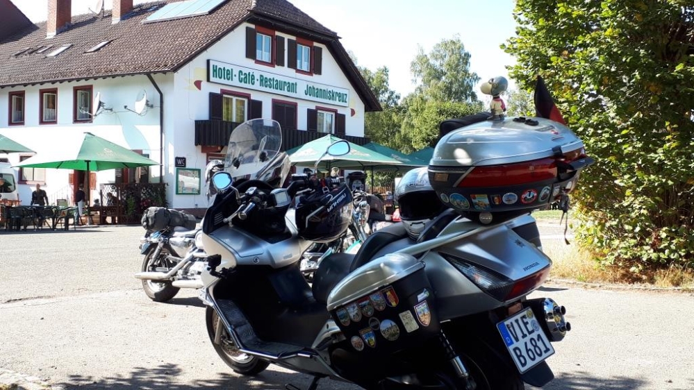 Am bekannten Bikertreff „Johanniskreuz“, mitten im Herzen des Pfälzerwalds, ist am frühen Morgen noch nicht viel los. Im Biergarten, gleich am Straßenrand, bleibt daher genug Zeit für zwei Cappuccini, ehe wir in das dunkle Grün des Elmsteiner Tals eintauchen. Hinter der gleichnamigen Gemeinde kommen wir auf die Hauptstrecke des Tales und sofort beginnt die Kurvenpracht. Rechts, links, rechts, links... schwingen wir hier schnell hintereinander und in flottem Tempo auf einem der schönsten Abschnitte der Strecke den Speyerbach und an der Bahnlinie des historischen Kuckucksbähnels entlang. Eine fantastische Motorradstrecke unterhalb der Ruinen der mittelalterlichen Burgen Elmstein, Breitenstein, Erfenstein und Spangenberg.