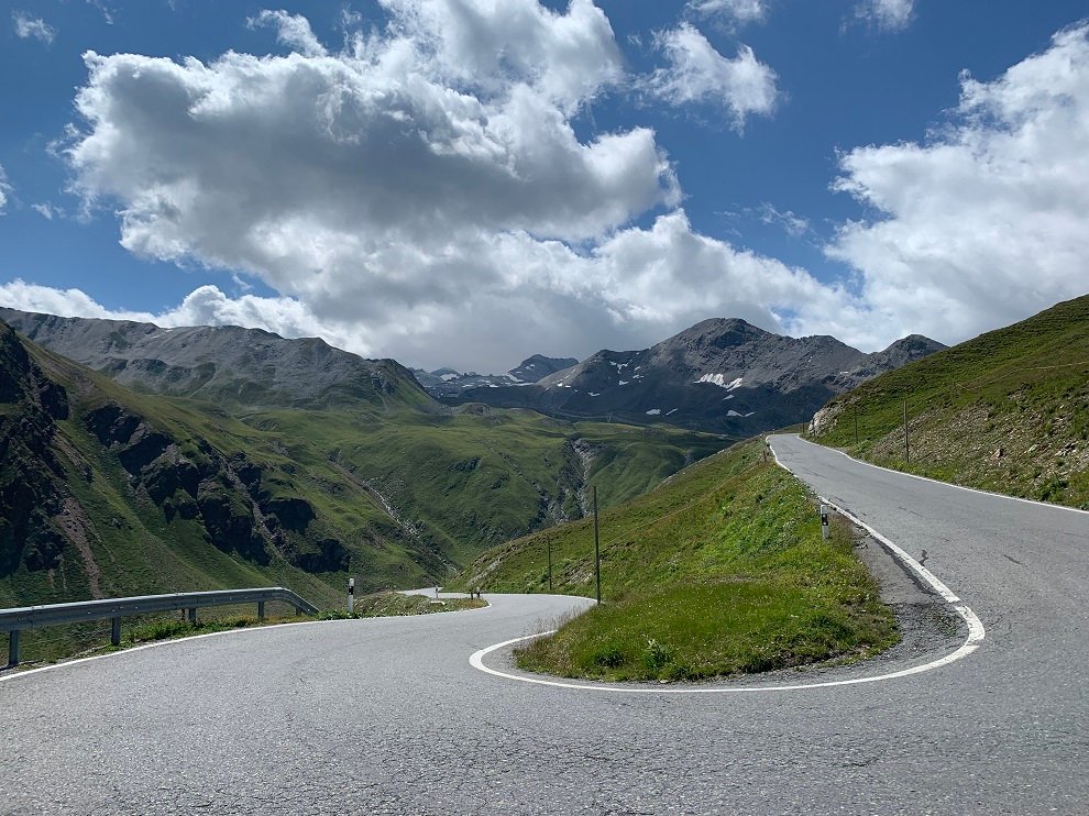 Wegen der begonnenen Sommerferien rechnete ich mit vielen rollenden Schikanen, aber außerhalb von Reutte und Imst bzw. auf dem kurzen Abschnitt der Fernpass-Route bis Bichlbach war ich nahezu allein auf der Straße. Selbst die Reschen-Bundesstraße zwischen Prutz und Pfunds überraschte mit freier Fahrt. Weil noch genügend Zeit zum Abendbrot war fuhr ich zum zollfreien Tanken und Einkaufen nach Samnaun. Die flüssigen Kehren der Norbertshöhe bildeten den letzten Höhepunkt des Tages, bevor ich am Hotel von Martin aka elsterracer mit einem Weizen in der Hand begrüßt wurde.
