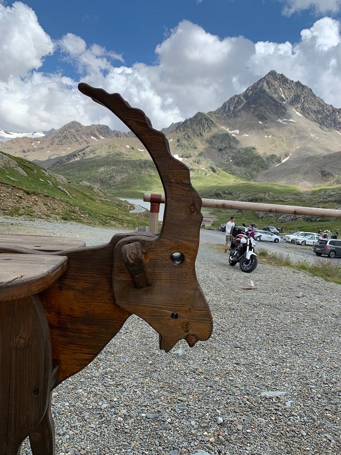 Auf dem Rückweg aus dem Tal hinaus kehrten wir ein für ein Eis, die erste Lokalität war voll, aber bei der zweiten gab es ganz tolle Erdbeerbecher. Und hier haben wir Wolfe wiedergetroffen, er kam vorbei, sah unsere Motorräder stehen, hielt an und setzte sich zu uns auf einen Kaffee. Er war auch den ersten Abstecher gefahren und hatte gesehen, dass da am Ende des Sees ein Auto gebrannt und den Stau ausgelöst hatte. Und er empfahl uns einen dritten Abstecher, nämlich am Reschensee rechts ab in das Valle Lunga, von dessen Ende habe man eine sehenswerte Aussicht zurück.