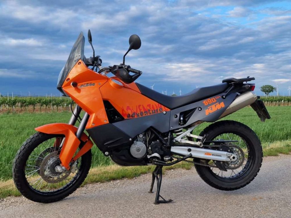 Erste Fahreindrücke, besonders im Vergleich zur Africa Twin. Es ist eine 2007er Adventure EFI, und die Wahl fiel aus zwei Gründen auf genau dieses Baujahr: Bei der Dakar aus 2011 war mir der Gasgriff zu giftig / zu digital. Da ich nur 1,74 groß bin, geht sich die R für mich nicht aus. Bei der Probefahrt fiel mir der Gasgriff der 990 Adventure als "handlich wie ein Vergaser" auf, und obwohl die 990er sehr sportlich ist, finde ich dass sie mit dem originalen Auspuff auch eine normale Gangart erlaubt.