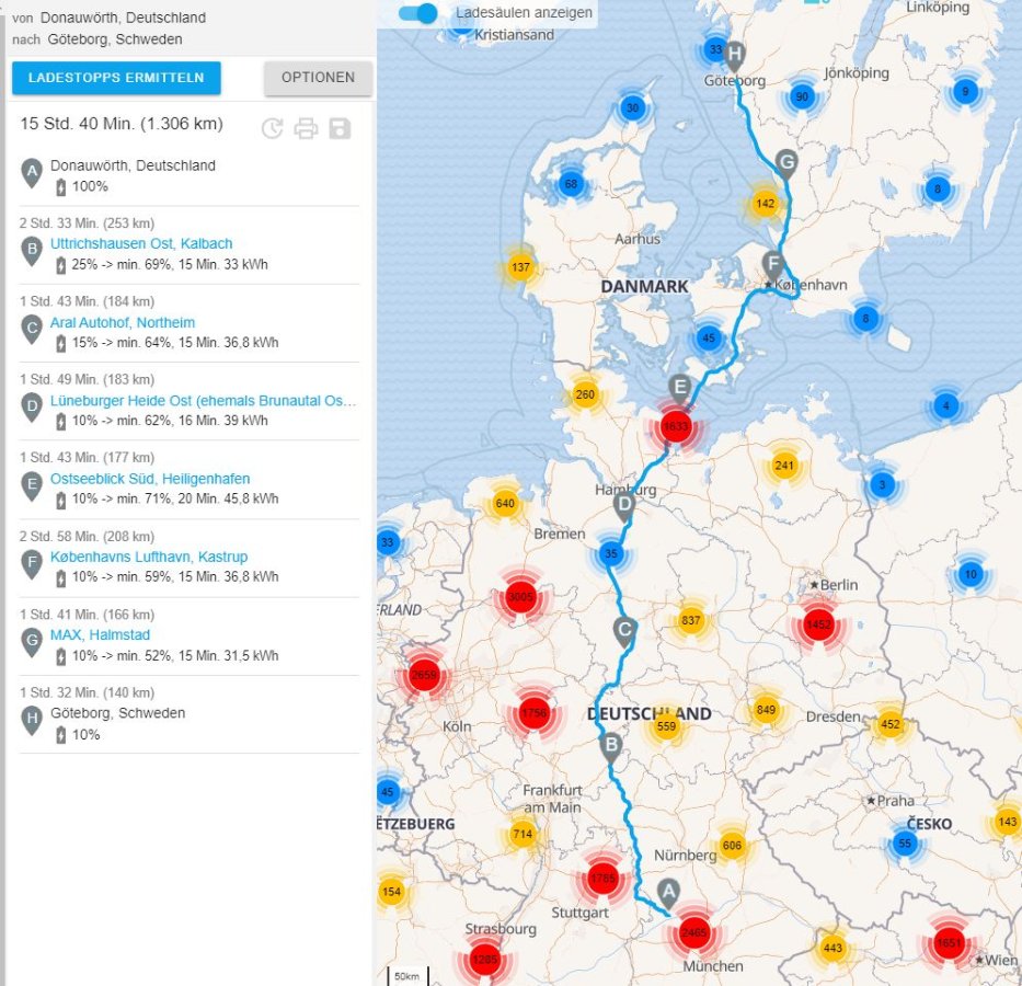 Wie schon erwähnt, baut mir das Betriebssystem nur EnBW und Plugsurfing Ladesäulen in die Route ein.