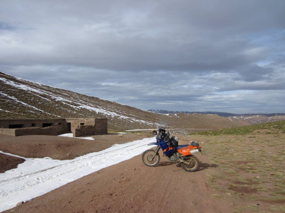 Nach einem guten Fruehstueck schwang ich mich aufs Motorrad und fuhr in die Todraschlucht. Es war noch frueh am Morgen und die Touristenshops am Strassenrand waren geschlossen. Unter blauem Himmel war ich bei guter Laune, aber sobald die Strasse sich aus der Schlucht herausgewunden hatte, sah ich die ersten Schneeflocken. Das Tal weitete sich auf, und ich konnte sehen, dass der blaue Himmel inzwischen zugezogen war. Noch schmelzte der Schnee in der Sekunde, in der er auf die Strasse fiel, aber es war klar, dass ich weiter oben im Schnee landen wuerde.