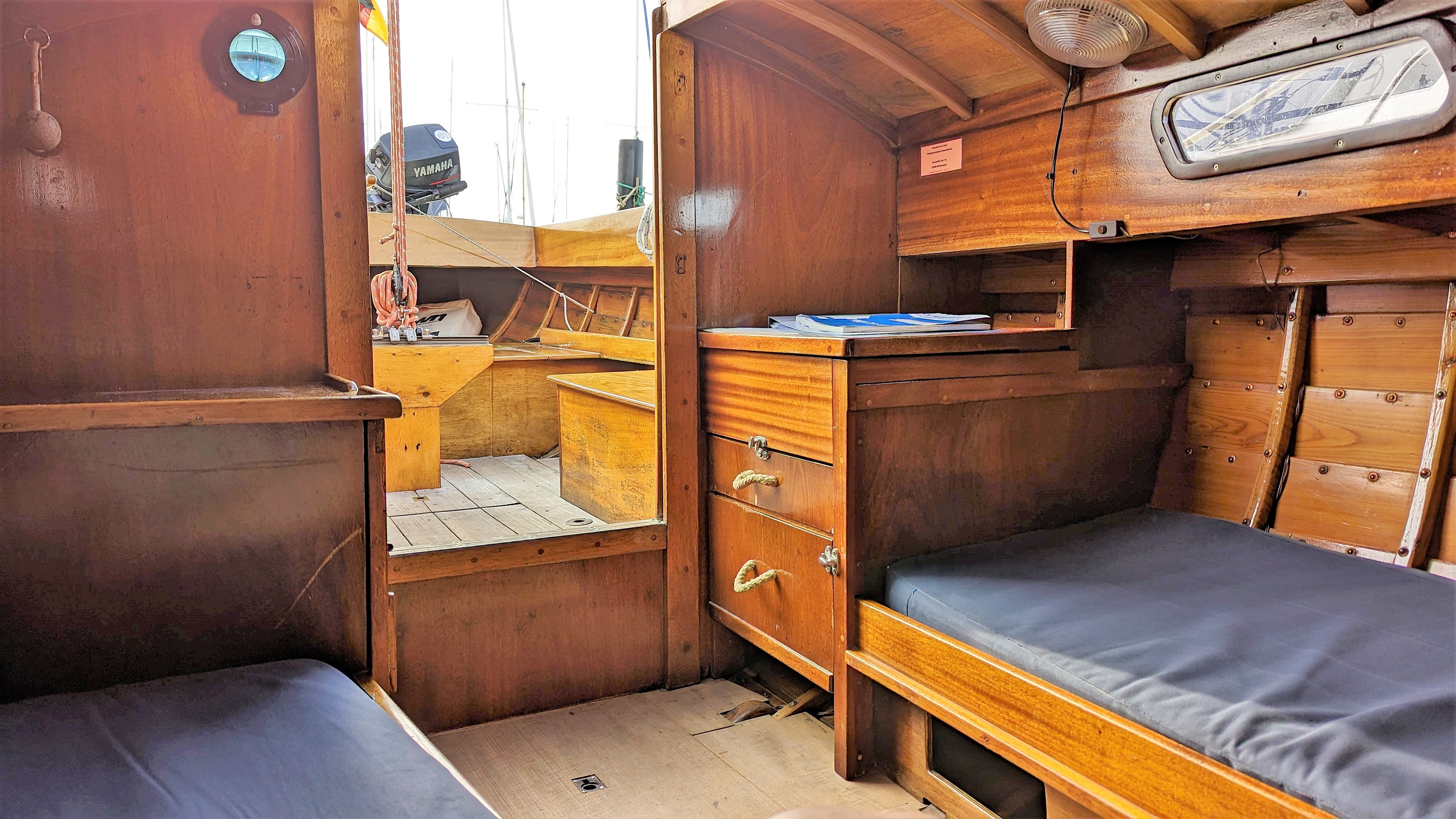 Das Leben an Bord verlangt allerdings ein gewisses Maß an Leidensfähigkeit (lediglich Sitzhöhe auf den schmalen Kojen, kein Klo, kein Waschbecken, ein kleiner Gaskocher), kompensiert durch die wunderschönen Linien und das traumhafte Holz. Der Außenborder ist lediglich eine Notlösung bei ausbleibendem Wind oder in unbekannten Häfen.