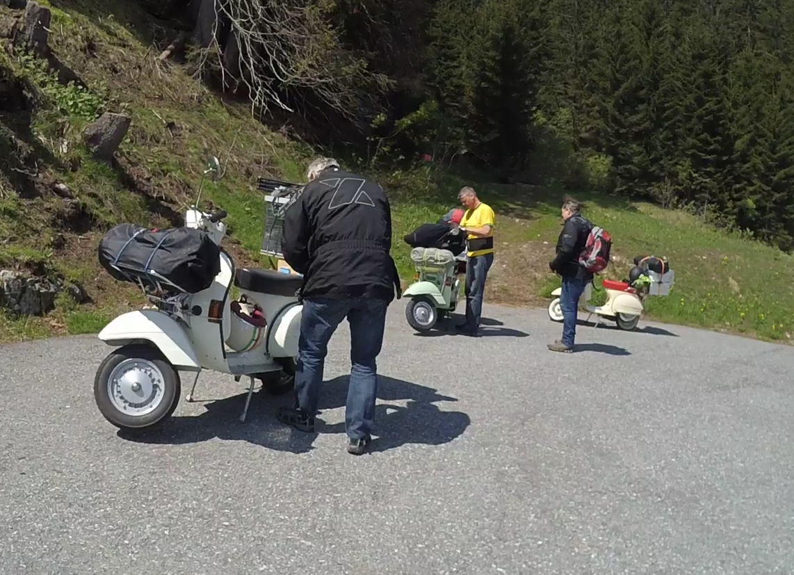 Diese Jungs aus Rastatt habe ich bei der Anreise am Fluela getroffen...sind auf dem Weg nach Sizilien. 2 x 200 ccm und 1 x 125 ccm aus den 80zigern...