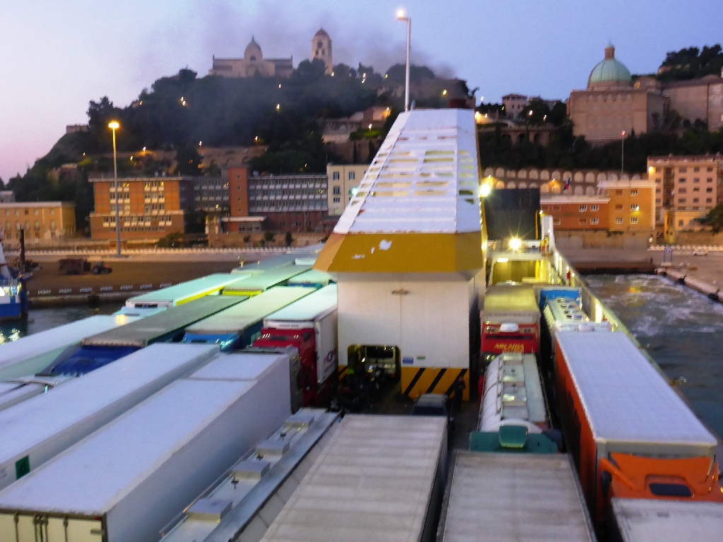Die Fähre hat dann, für uns und die meisten Passagiere überraschend, einen Zwischenstopp in Ancona eingelegt. Da wurde dann das LKW-Deck richtig voll gemacht, und noch einige Hells Angels kamen an Bord. Nachts ging es in der Bar der Fähre entsprechend hoch her, der Alkohol wurde nicht gläser-, sonder flaschenweise geordert. Geld spielte bei einigen keine Rolle. Von Sach- oder Personenschäden ist aber nichts bekannt geworden.