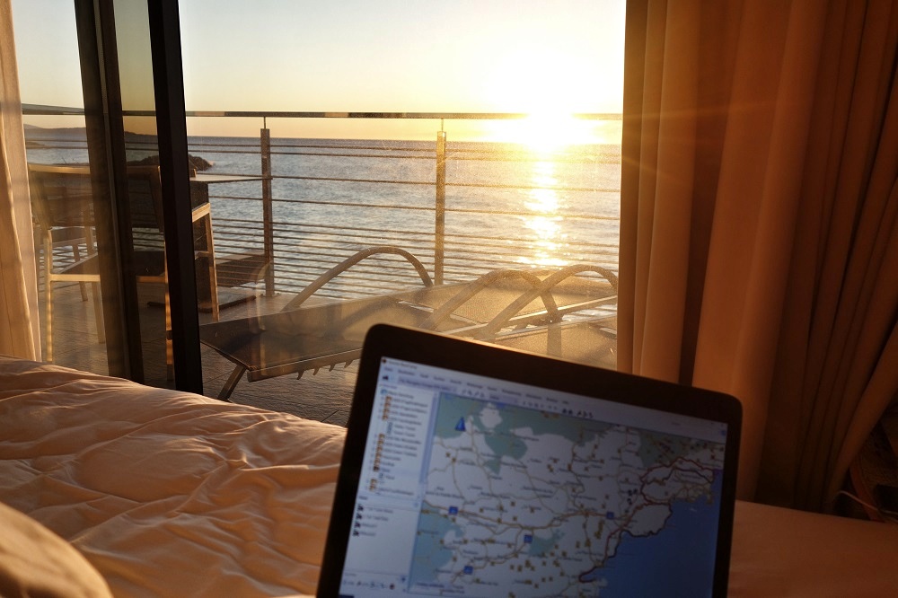 Der Sonnenaufgang mit Blick aufs Meer ist sensationell! Ein Stuhl, eine Sonnenbrille... Da würde ich sogar das Mopped stehen lassen.