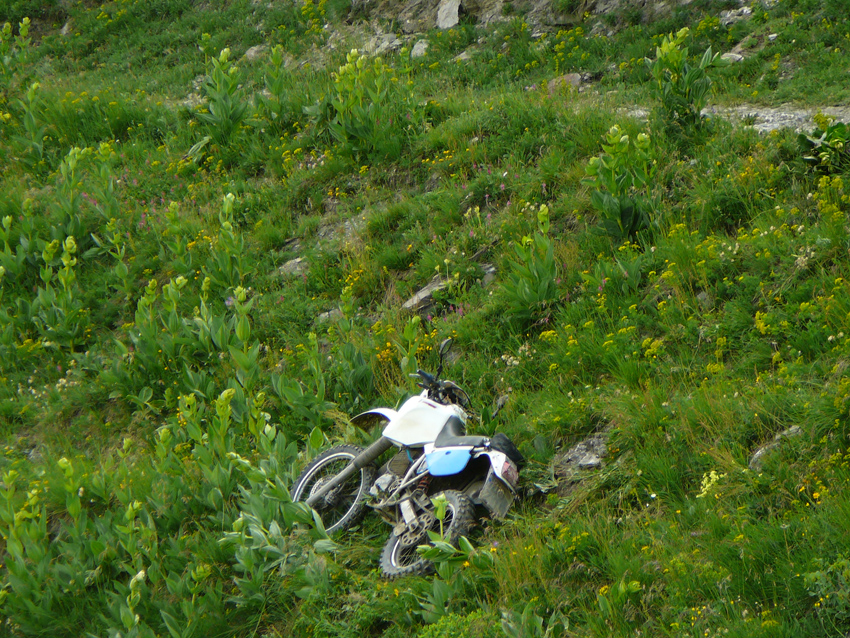 Natürlich sollte man da nicht alleine rumkurven! Es war schon schwer genug die XR 600 zu bergen, 100kg mehr dürften richtig spaßig werden und man trifft dort sehr selten auf Leute die helfen könnten. Da gab es eigentlich keinen Grund zu stürzen, er hat einfach einen Moment nicht aufgepaßt und einen Stein "gefunden".