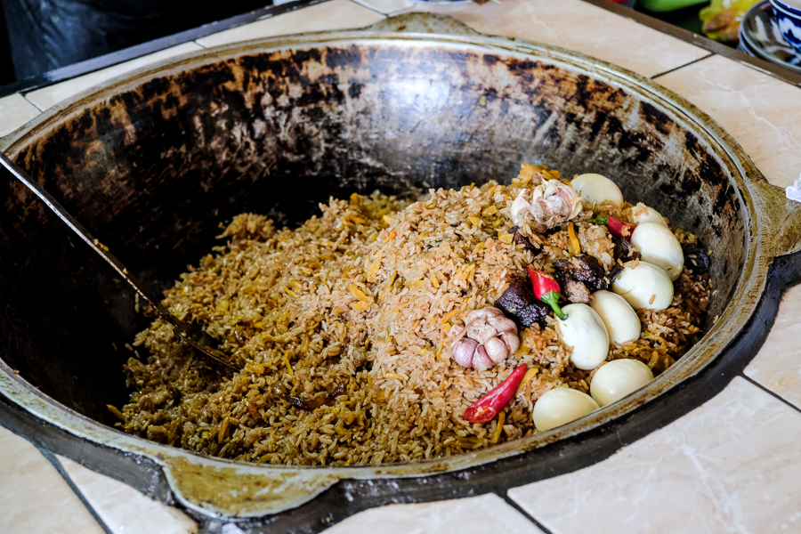 Ich sitzte im Bazar in einem Restaurant, im Freien, direkt an einem Fluß. Es gibt Plew, eine usbekische Spezialität. Ein Reisgericht, mit einer speziellen Reissorte. Dazu gibt es ein wenig Fleisch, Grammel, Gemüse und einer Joghurtsauce. Das ganze schwimmt im Öl. Dazu gibt es mal wieder eine Kanne grünen Tee. An meinem Tisch sitzt ein alter Mann, der etwas grimmig drein schaut, aber eigentlich sehr freundlich ist. Wann immer Kinder um die Ecke huschen, dann leuchten seine Augen und er schenkt den Kindern sein Lächeln.