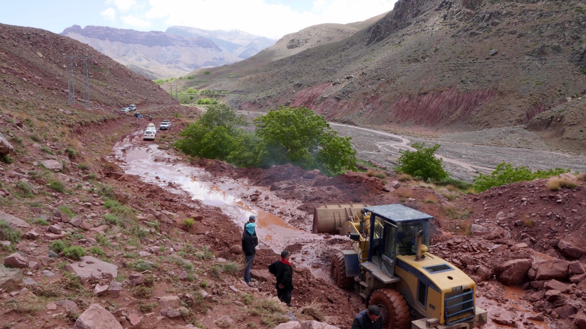 Nach 3 extrem mühsamen und anstrengenden Stunden Fahrt mit einigen manchmal hunderte Meter langen fast knietiefen Schlammdurchfahrten war nach 70 Kilometern endgültig Schluss. Die grossen Räder vom Bagger der die Strasse räumte waren manchmal zu einem Drittel im Schlamm verschwunden. Da schon halb vier am Nachmittag war und wir noch fast doppelt so viel Weg zum endgültigen Ziel vor uns als hinter uns hatten entschloss ich mich umzudrehen und wieder nach Demnate zurück zu fahren.