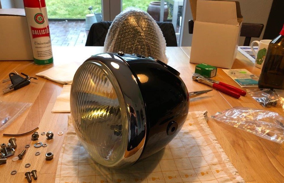 So sieht das fertige Lampengehäuse (gedruckt) mit eingebauten Tacho und M-Lock-Empfänger an der Diesel mal aus: