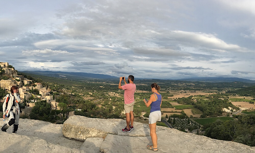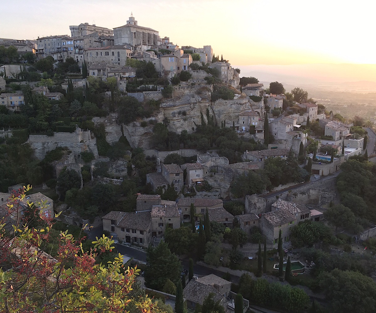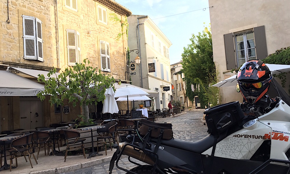 Heute Tour #5: Abfahrt um 6:30, der Ventoux schon im Morgenlicht aus zu sehen von unserem Haus Fahrtrichtung Gordes ... dort sind wir erstmal verhockt, so toll war die Aussicht: Blick Richtung Luberon (auf dem Kamm waren wir schottenderweise letzte Woche): Dann weiter nach Lourmarin mit Frühstück mitten drin: