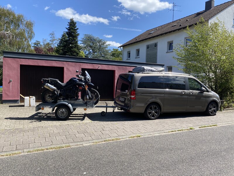 Die in der engeren Wahl gesetzte Yamaha Tenere 700 fiel wegen Nachbesserungsbedarf bei Federelementen für den 2Personenbetrieb, nicht geschraubtem Heck und Bauhöhe (ohne größeren Umbau kaum in den MB-Bus zu bekommen) aus dem Raster.