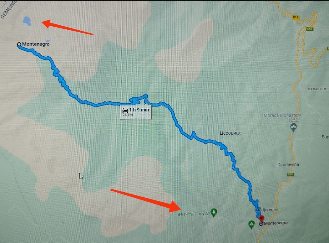 Auf dem Bild in grün markiert ist geteert, also das Stück von Niksic hoch zum See.