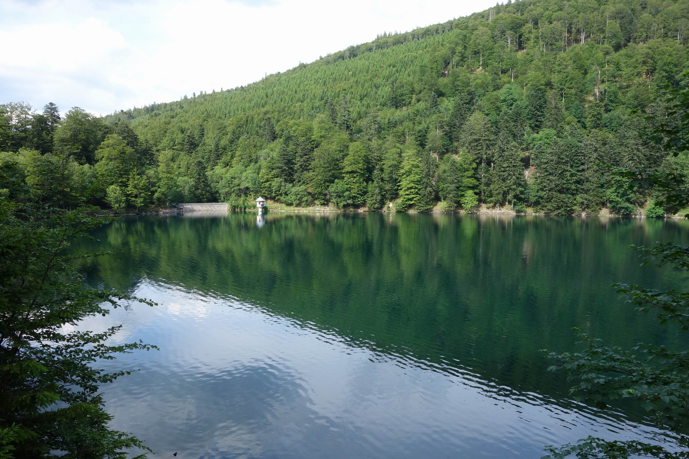 Lac du Ballon; Zufahrt über schlaglochgeprägte Bergstrecke/Sackgasse. Der See ist sehr klar, hat einen kleinen Badestrand. Um den See führt eine unbefestigter Weg bis zur Ferme Auberge du Gustiberg. Wegen Zeitdruck im Genick sind wir nicht bis ganz zur Ferme gefahren. Es war kein Verbotschild aufgestellt. Bild vom Lac: