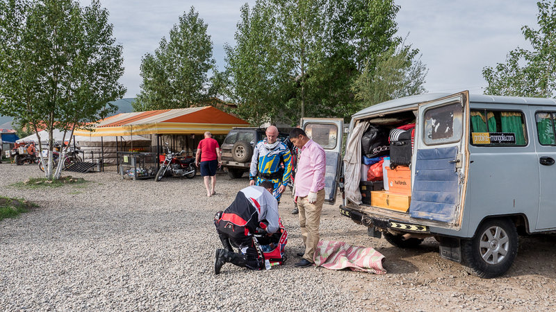 Während Wolf und ich uns noch den Schlaf aus den Augen reiben, trifft Jagaa mit Harry ein den er in der Früh vom Flughafen abgeholt hat. Der Österreicher ist Mitbegründer und -besitzer von probike-mongolia. Nachdem wir in Ruhe gefrühstückt haben setzen wir uns zusammen und besprechen so ein bisschen den Ablauf der Tour. Danach gehts ab in die Garage wo wir "unsere" Betas besichtigen, probesitzen und letzte Anpassungen vornehmen.