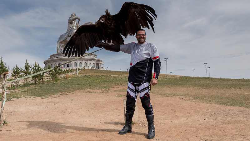 Während wir die Fahrzeuge auf dem grossen Platz parkieren und uns soweit wie möglich unserer Montur entledigen werden wir von riesigen Vögeln beobachtet. Die grossen Raubvögel sind offensichtlich ein beliebtes Fotomotiv mit dem sich die Touristen mehr oder weniger gerne ablichten lassen. Mir tun die Vögel leid, aber nachdem sich Wolf und danach auch Harry für ein Foto in Pose werfen kann ich natürlich nicht zurückstehen und lasse mich mit einem Geier ablichten. Das "Vieh" ist ganz schön schwer, seine Flügelspannweite grösser als ich von Kopf bis Fuss lang bin und so bin ich nicht unglücklich den Vogel wieder abgeben zu dürfen. Ausserdem schaut mich der Vogel an als hätte er noch nicht gefrühstückt. Trotzdem, den ganzen Tag auf einem Pfahl in der prallen Sonne sitzend und mit Touristen (wie mir) abgelichtet werden... ich kann mir schöneres vorstellen für so ein majestätisches Tier.