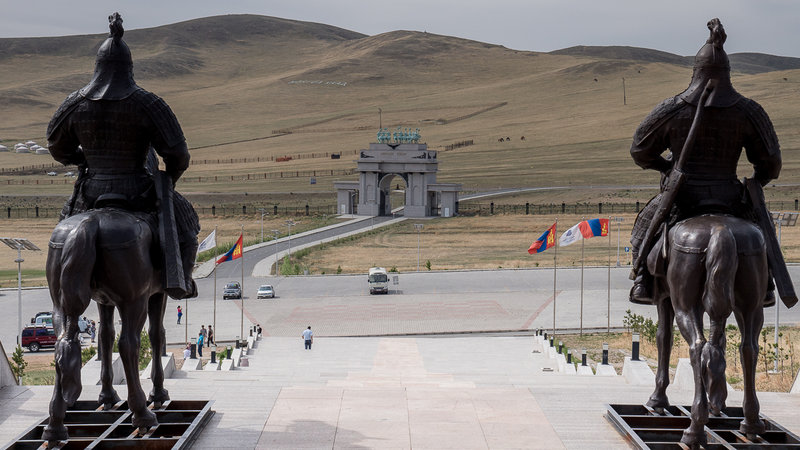Der nächste Morgen, endlich gehts richtig los. Ich habe gut geschlafen und fühle mich fit und ausgeruht. Auch die anderen machen einen munteren Eindruck. Wir packen unser Zeugs und tragen es runter in den Garten damit es in das Begleitfahrzeug verstaut werden kann. Dasha, unser Fahrer und Jagaa, unser Guide sind schon fleissig Ersatzteile und Material für die Tour am verladen während wir in Ruhe frühstücken. Dann ist es soweit... Helm auf, Motoren an und los gehts Richtung Abenteuer. Allerdings nur ca 200 Meter weit um die Ecke vom Oasis da die Betas, das Begleitfahrzeug und die Reservekanister betankt werden müssen. Danach verlassen wir die Stadt in östlicher Richtung, Ziel Chinggis Khaan Monument.