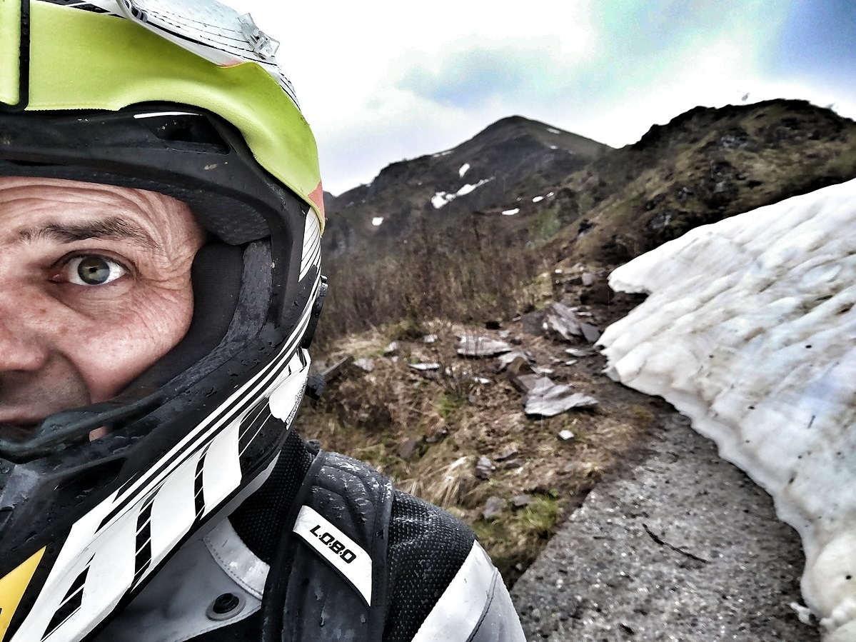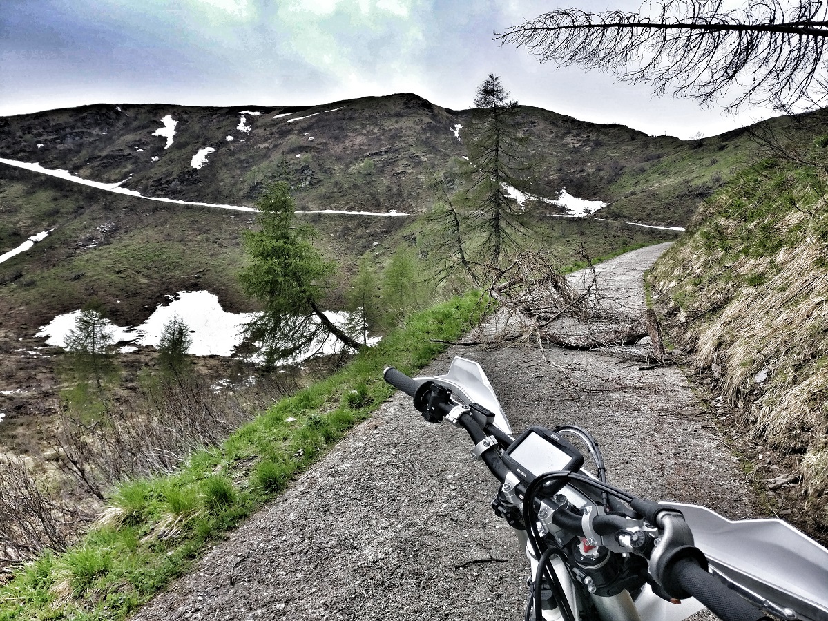 Ziemlich oben war dann aber Schluss wegen Schnee. Die Endurofahrer haben kurz überlegt, die hätten wahrscheinlich schon rechts daneben vorbei fahren können. Evtl. wäre aber in der nächsten Kehre nochmal so ne Schneefront gelegen und so haben sie es nicht gewagt. Ich hatte eh das falsche Töff dafür...