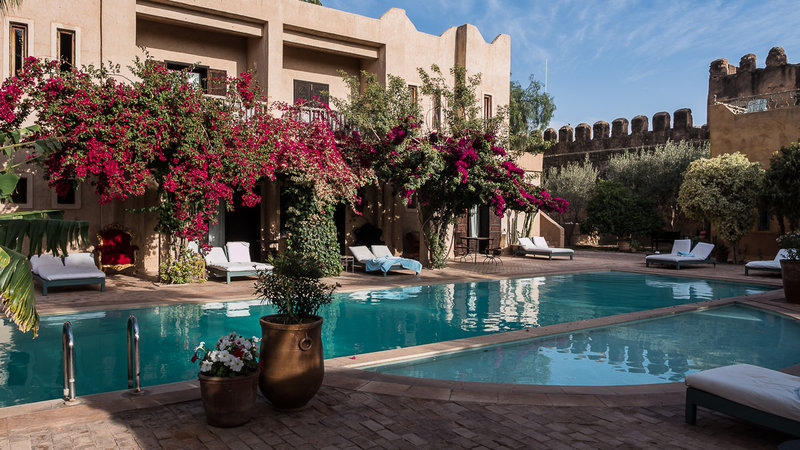 Unsere Unterkunft, das „Dar Tourkia„, entpuppt sich als weiteres Paradies. Versteckt hinter alten Mauern und einem grossem Holztor liegt ein traumhafter orientalischer Garten mit Palmen, Orangenbäumen, Bougavillea, Zitronenbäumen, Euphorbien aller Art, Kakteen usw. In der Mitte der türkisblaue Pool um den sich die Zimmer gruppieren. Riesige Zimmer mit alten Holzmöbeln und im maurischen Stil gekachelte Bäder mit goldenen Messingwaschbecken. Es ist wie in 1001 Nacht und wir können unser Glück kaum fassen. Ein Teil der das Grundstück umgebenden Mauer gehört zur alten, aus Lehm gebauten Festigungsmauer welche sich rund um die ganze Stadt herum zieht und welcher wir später am Abend fast um die ganze Stadt herum entlang spazieren.