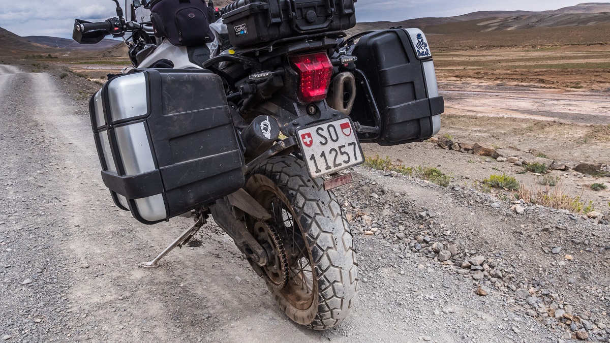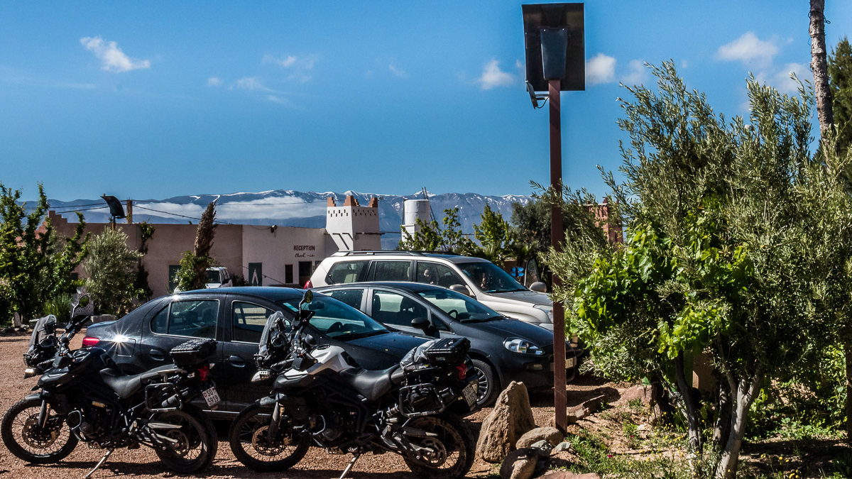 Unsere Reise führt uns weiter durch ein Tal, einer riesigen und sehr eindrücklichen Flussoase. Vom Wasser des Flusses sieht man nichts, jedoch einen Fluss ganz aus Palmen mitten in der trockenen Einöde. Danach überqueren wir mehrere kleine Pässe und staunen weil sich hinter jedem Pass eine völlig neue Welt eröffnet. In anderen Farben mit anderen Steinen und Pflanzen. Es ist schon gegen 19 Uhr und wir sind sehr müde als sich der Himmel in alle möglichen und unmöglichen Farben verfärbt wie wir es noch nie zuvor gesehen haben. Es herrscht richtige Weltuntergangstimmung. Der Wind frischt böig, ja fast sturmartig auf und es wird plötzlich sehr kalt. Nur mühsam kommen wir vorwärts, der Wind reisst an den Motorrädern und drängt uns mal auf die eine und dann wieder auf die andere Seite unserer Spur. Vor uns tut sich eine Wand auf welche sich vom Boden bis hoch hinauf in den Himmel zieht und in den unglaublichsten Farben schimmert. Pascal möchte das Spektakel gerne fotografieren, mir jedoch macht es Angst und so dränge ich zur Weiterfahrt. Schliesslich wird auch Pascal etwas nervös und so geben wir auf unseren Tigern nochmal richtig Gas. Kaum haben wir die sichere Hotelanlage erreicht, fallen die ersten schweren Tropfen und es kracht gewaltig. Vielmehr ist dann allerdings nicht mehr daraus geworden, ausser einem kräftigen Temperaturstutz und Schnee auf der Bergkette vor unserem Hotel.