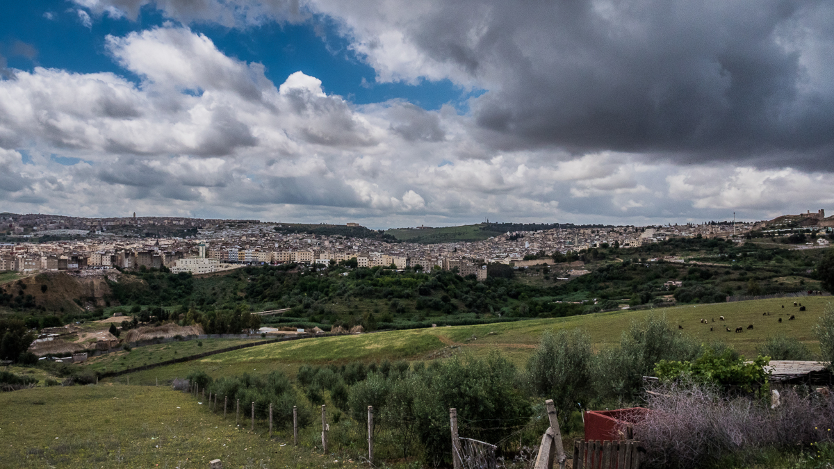 Und plötzlich ist es grün! Die Gegend um Fès erinnert mich mit ihrer grünen, weichen, hügeligen Art eher an die Toskana als an eine marokkanische Landschaft. Wieder einmal staunen wir wie abwechslungsreich und voller Überraschungen dieses Land doch ist. Schliesslich erreichen wir Fès, können jedoch das Hotel, welches in der Medina, aber direkt anfahrbar sein soll, nicht finden. So landen wir irgendwann in einer Slumsiedling unterhalb der Stadt. Beim Navikonsultationsstop eilt sofort Hilfe herbei. Der Mann auf dem Moped folgt uns schon eine ganze Weile. Er beteuert dass es ein direkt anfahrbares Hotel wie wir es suchen in der Medina nicht gibt, das unser geplanter Weg nicht befahrbar sei, er aber ein tolles Hotel kennen würde. Mittlerweile mit den geschäftstüchtigen Praktiken der Marokkaner vertraut lässt sich Pascal nicht aus der Ruhe bringen und lässt den fuchtelnden und rufenden Typen dankend stehen.