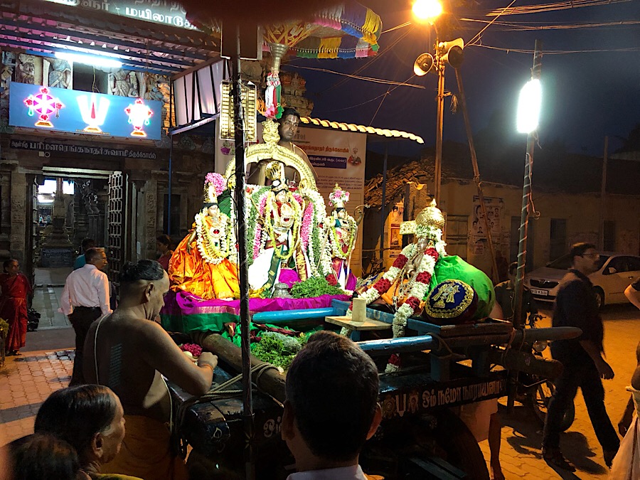Es ging wieder zurück. In einer Vorkammer arbeiteten Priester oder Mönche (oder Ministranten in fortgeschrittenem Alter) mit freiem Oberkörper daran, eine Gottesstatue auf einen Karren zu wuchten. Dabei ein Grüppchen Jungfrauen, die ihnen ehrfurchtsvoll kichernd zusahen. Ein Beistehender erklärte mir alles in brüchigem Englisch. Ich kapierte nicht sehr viel, war aber schweiß- und ehrfurchtsvoll.