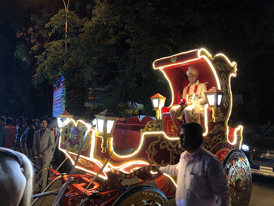 ... dann das Musikfahrzeug gefolgt von Band und maskierten Tänzern, die Jungfrauen, ein Jeep mit daraufmontierten Flakscheinwerfern und Riesendieselgenerator dahinter, dann viele Männer im gleichen Hemd und schliesslich, in gleißendem Licht, Hari in einer hellerleuchtenden Kutsche, gezogen von zwei abgemagerten, geschmückten Schimmeln - wie ein Maharadja! Keine Spur von der Braut. Feuerwerk wurde gezündet und die Band spielte, dass einem die Ohren wegflogen. Es hatte etwas von rhythmischer, badischer Guggenmusik zur Fasnacht und es wurde auch dazu getanzt. Sensationell! Ich hätte fast ein paar Tränen der Rührung verdrückt für den lieben Hari - was für ein Akt ihm zu Ehren! Ich war wirklich ergriffen!