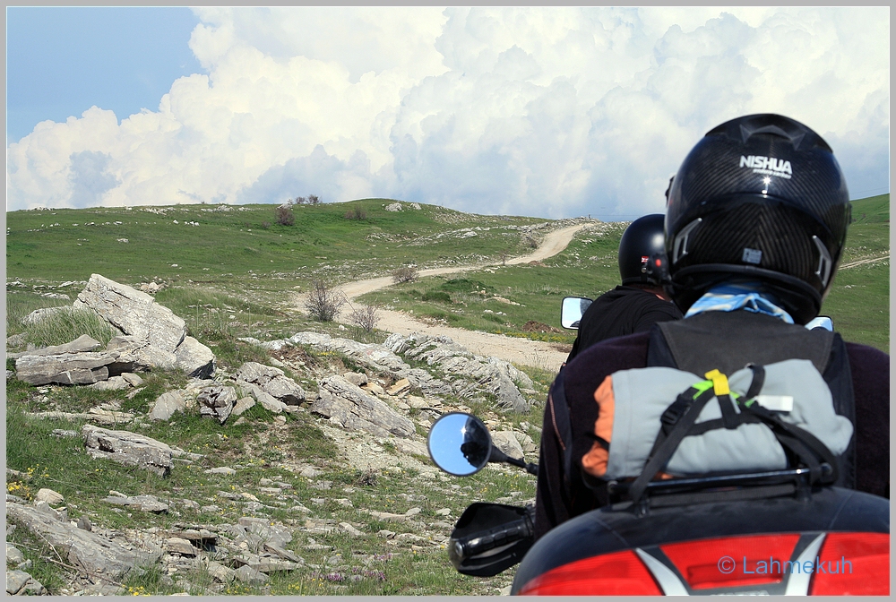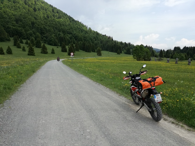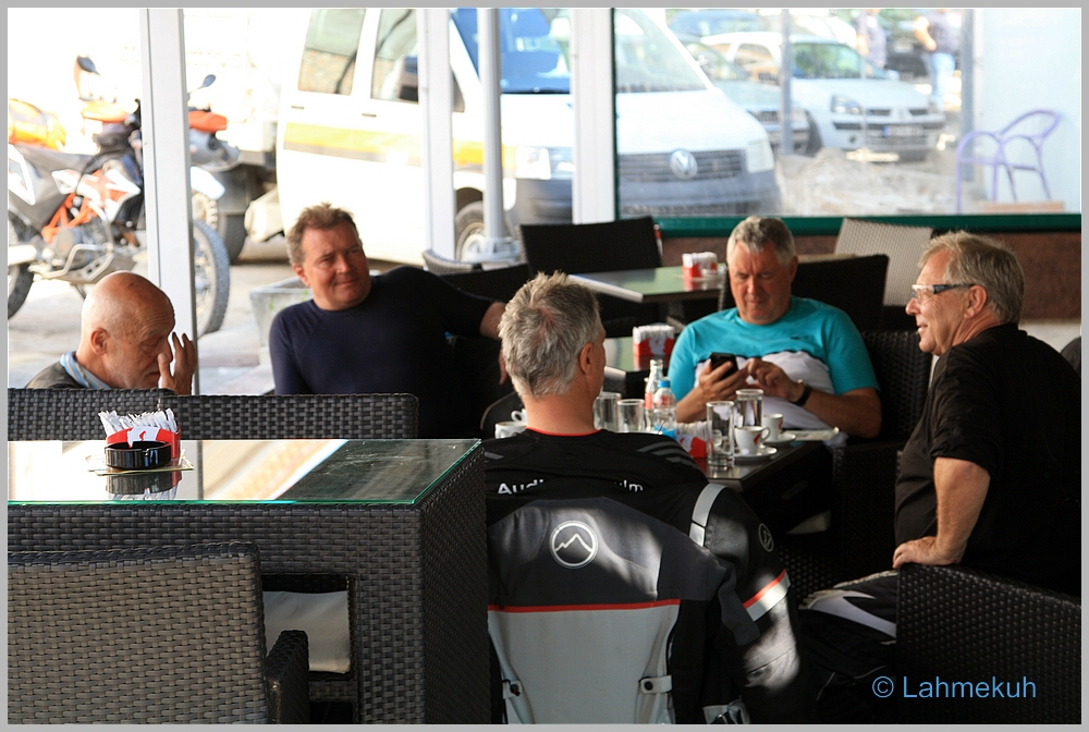 Schnell noch ein Käffchen in Gacko in B-H und ein Plausch mit einem Amerikaner aus Wyoming, der seit Monaten schon mit dem Moped unterwegs war (u.a. Südamerika, Spanien, Alpen, etc.) und noch einiges vor sich hatte.